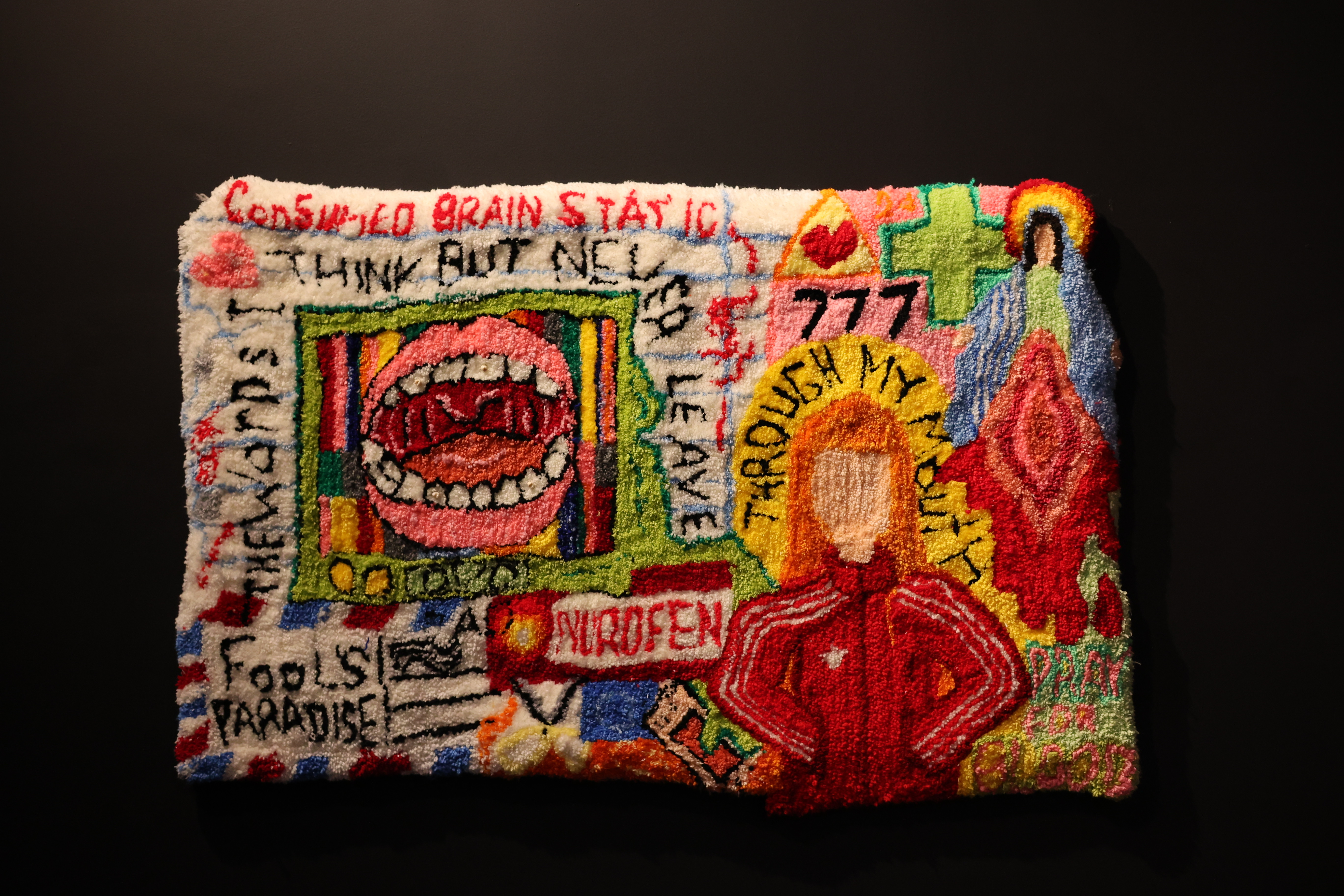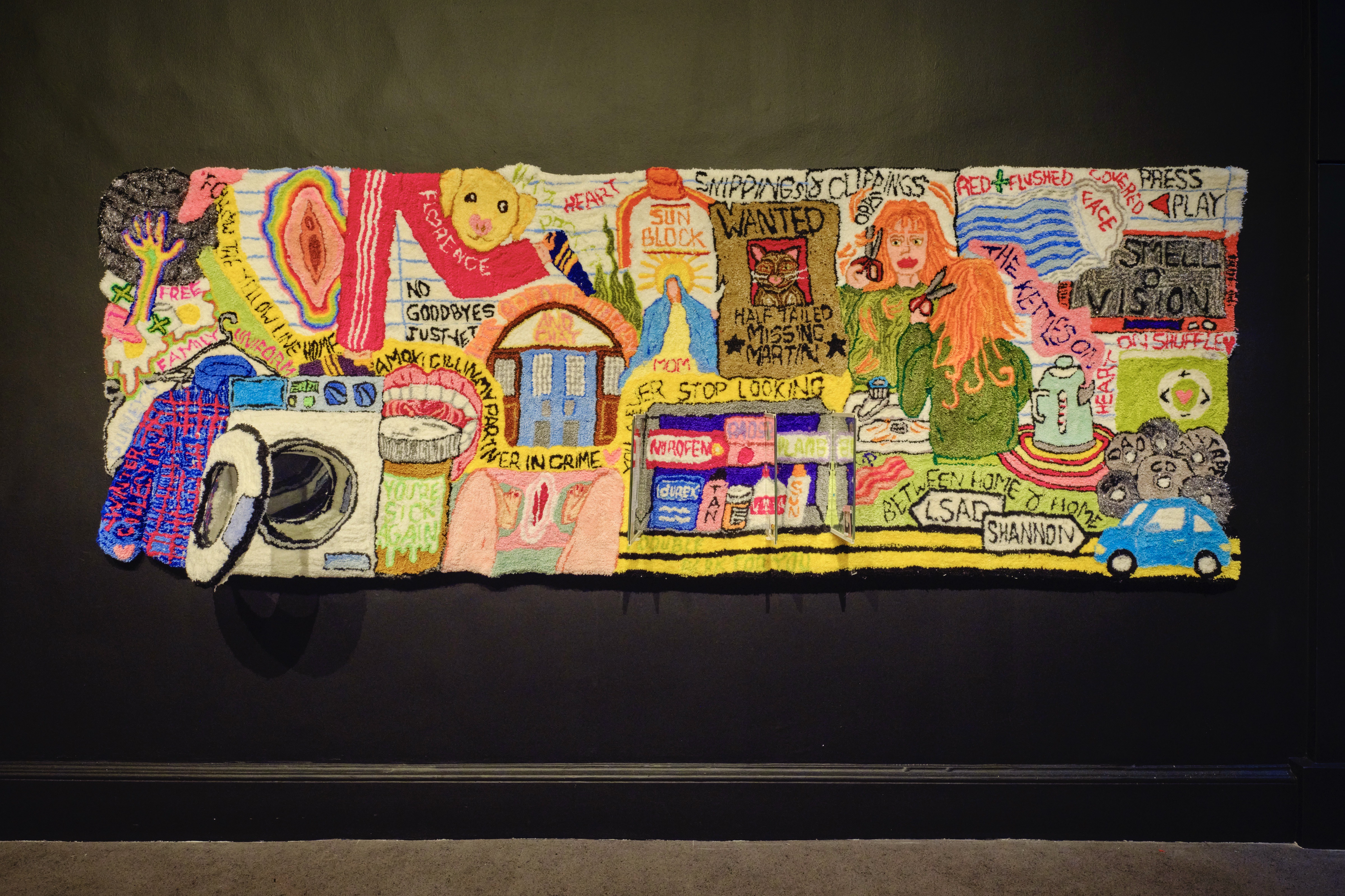 She creates experimental films in tandem with these diaristic textile works, combining them into non-linear, non-conventional storytelling. By interweaving visual and tactile media, Murray produces rhythmic collages of moving images and sounds, creating emotive engagement. The combination of playful 3D tufted objects with vivid, bright films forms unexpected and humorous perceptions, inviting viewers to consider how objects, memory, and consumer culture shape identity and experience.